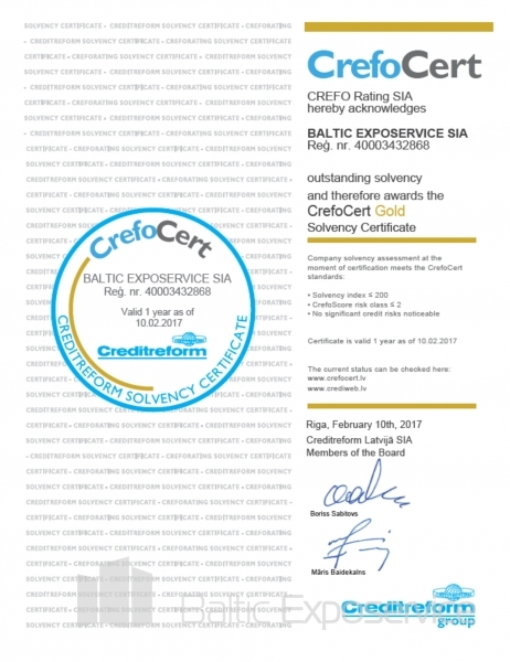 Company Baltic Exposervice for the third consecutive year has kept perfect solvency indicators and repeatedly receives CrefoCert Gold certificate stating the company’s excellent paying capacity, supreme culture of discipline towards payments and the stability of the company.